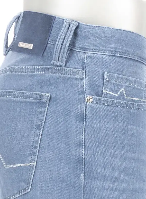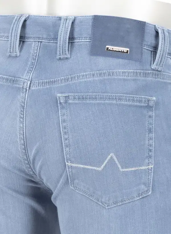 De Pipe maakt indruk met zijn innovatieve materiaalmix van katoen, gerecycled polyester en viscose, wat de denim een zijdezacht gevoel en natuurlijke bewegingsvrijheid geeft. Het hoge katoengehalte zorgt voor ademend vermogen en duurzaamheid, terwijl het elastaangehalte de pasvorm de hele dag behoudt. Bij een gewone pasvorm zitten de spijkerbroeken gelijkmatig op het dij en onderbeen – ideaal voor zowel het dagelijks leven als het werk. De klassieke vijf-zak constructie wordt aangevuld met een praktische Safe Pocket aan de binnenste tailleband, die kleine voorwerpen betrouwbaar vastzet. Alberto perfectioneert al meer dan 100 jaar de kunst van het passen van broeken