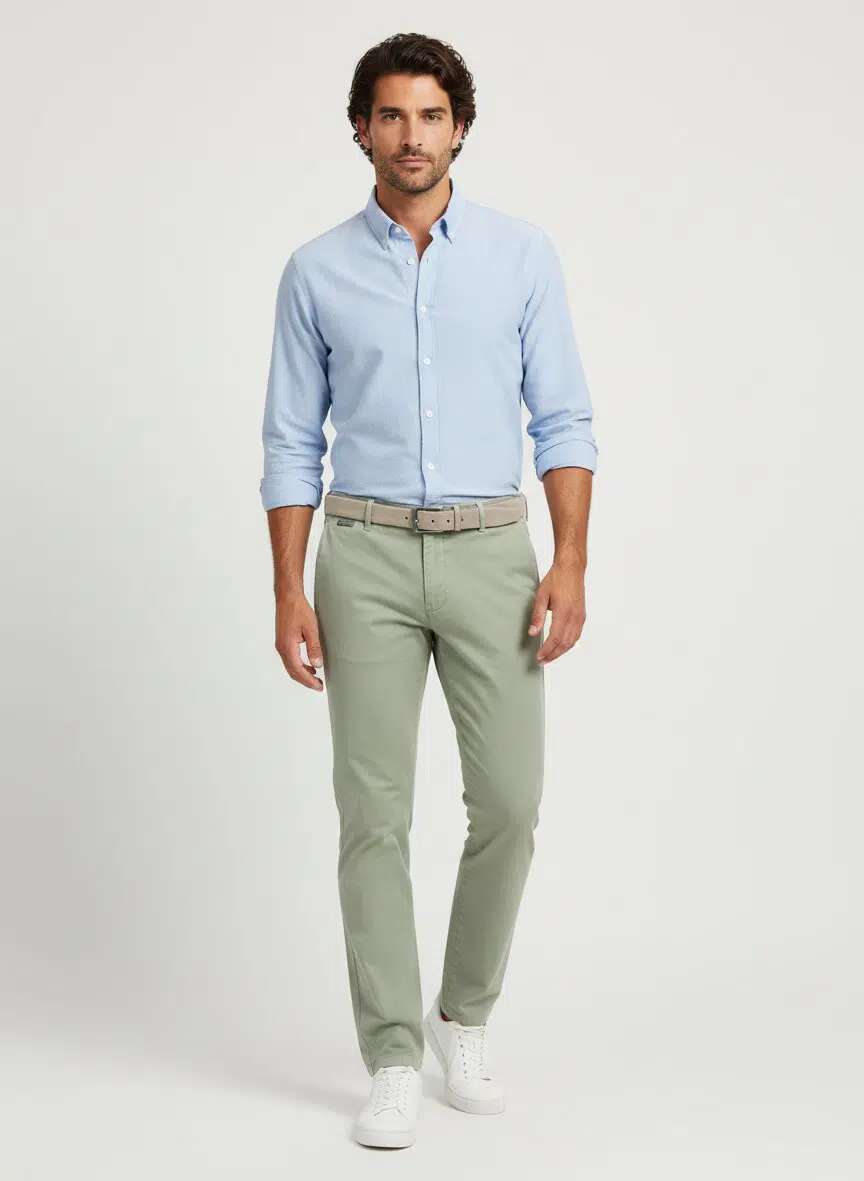 Onze tip: Combineer de lichtgroene jeans met een crèmekleurig linnen overhemd en witte sneakers voor een frisse, zomerse look die elegantie en lichtheid uitstraalt.