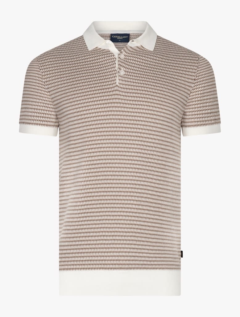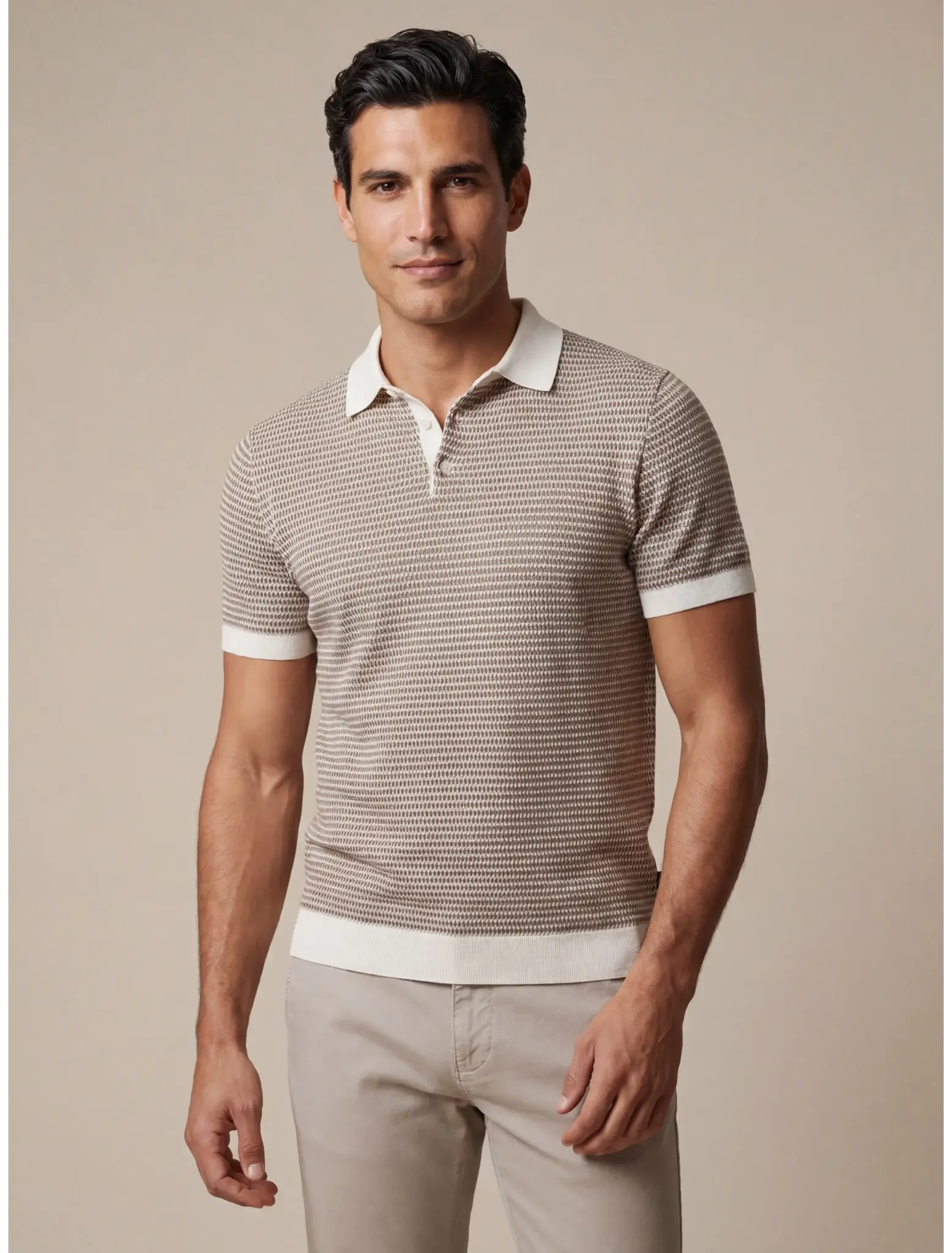 Ontdek de Multipo Polo, een stijlvolle gebreide polo in de kleur taupe. Deze polo is uitgevoerd in een beige, taupe en off-white katoenjacquard voor een grafische, eigentijdse uitstraling. Gemaakt van 100% katoen biedt de Multipo Polo een zachte, ademende kwaliteit en optimaal draagcomfort. De regular fit zorgt voor een tijdloze pasvorm, terwijl de contrastkleurige polokraag en biezen bij de mouwen een moderne touch toevoegen. Perfect te combineren met jeans, een chino of pantalon. De Multipo Polo combineert vakmanschap, stijl en comfort en is een veelzijdige must-have voor iedere garderobe.