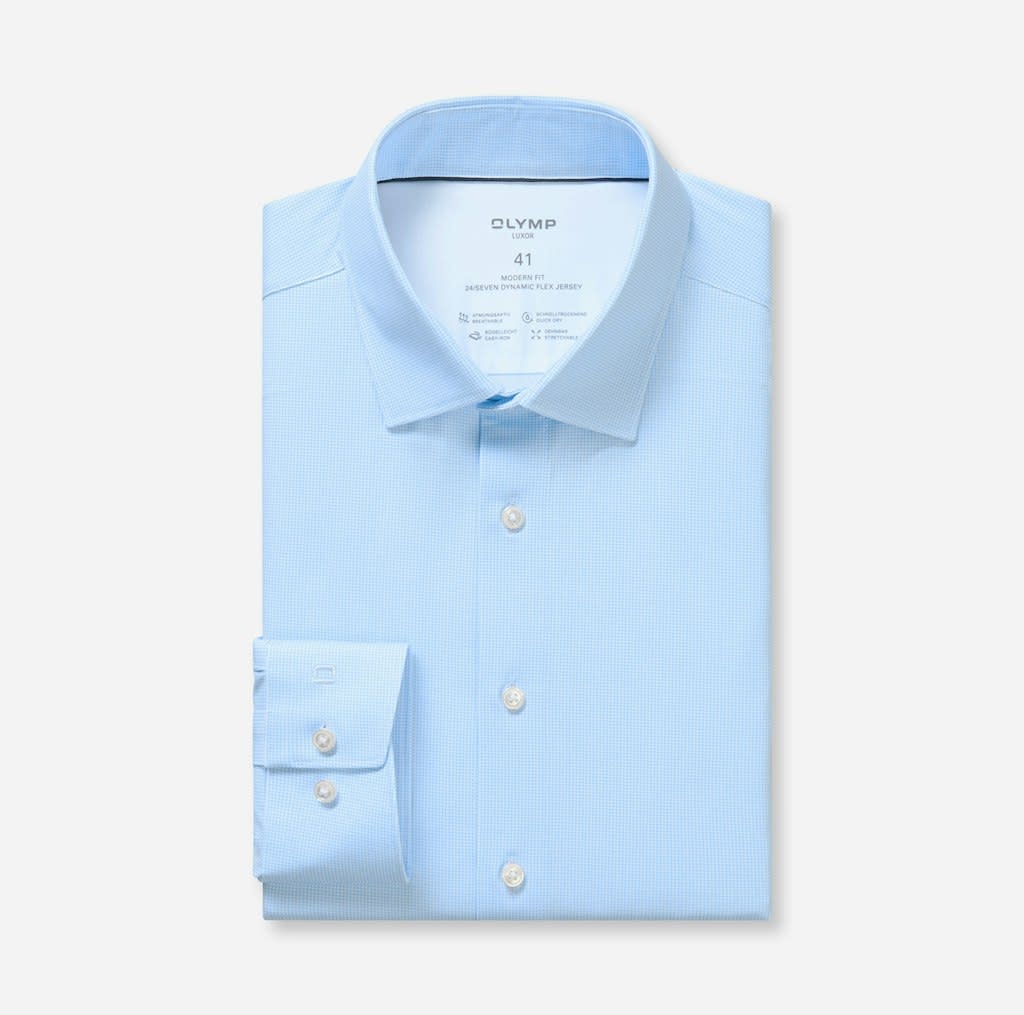 Altijd in persoonlijke topvorm: deze innovatieve OLYMP Luxor 24/Seven combineert het comfort van een T-shirt met de scherpe uitstraling van een businessoverhemd. De gladde textuur van de Dynamic Flex-jersey is ademend, sneldrogend, rekbaar en gemakkelijk te strijken. Met een nette new-kentkraag en sportieve pasvorm.
