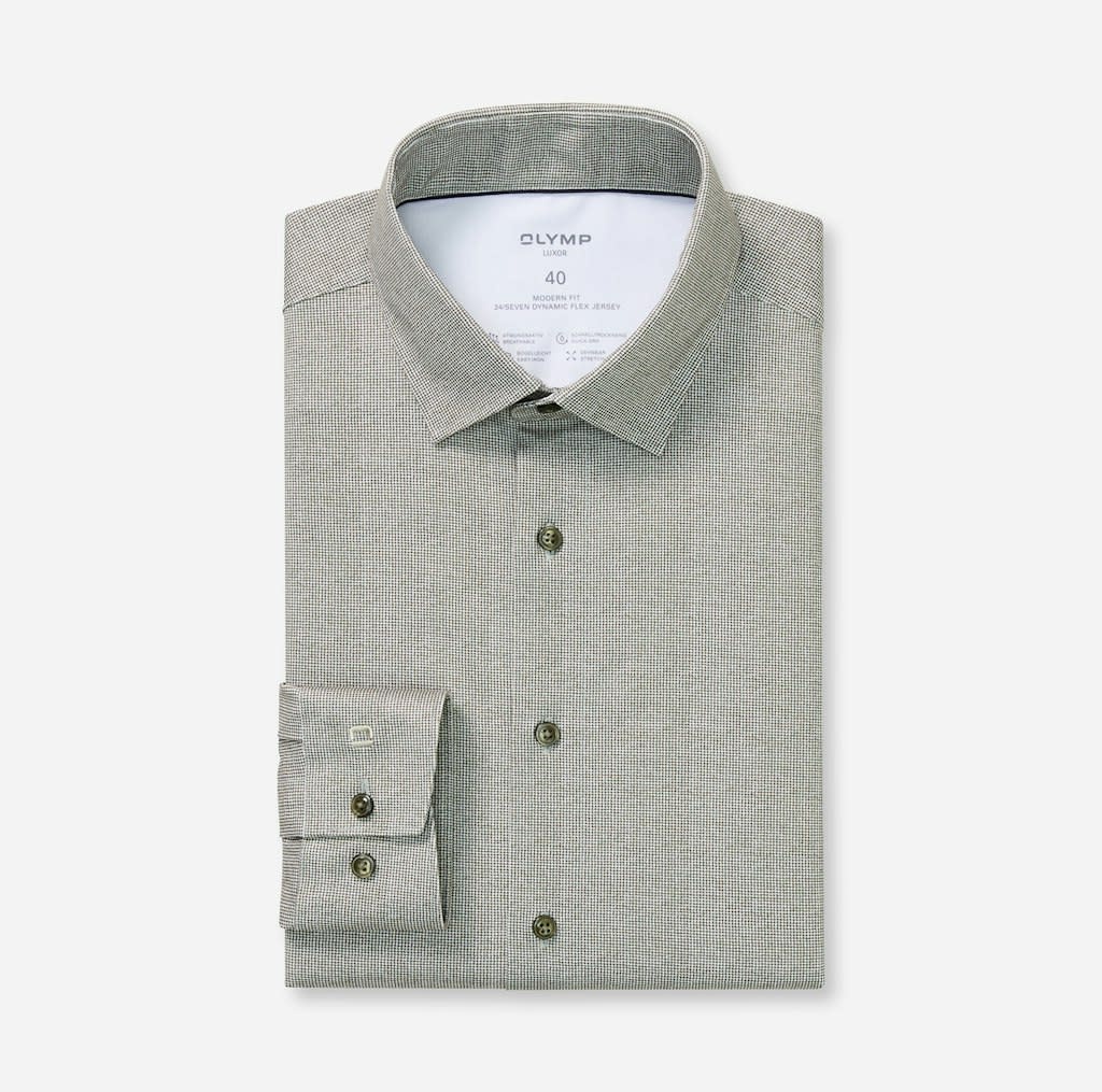 Altijd in persoonlijke topvorm: deze innovatieve OLYMP Luxor 24/Seven combineert het comfort van een T-shirt met de scherpe uitstraling van een businessoverhemd. De gladde textuur van de Dynamic Flex-jersey is ademend, sneldrogend, rekbaar en gemakkelijk te strijken. Met een nette new-kentkraag en sportieve pasvorm.