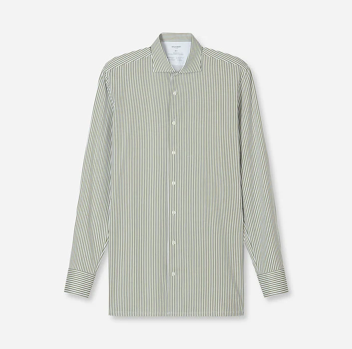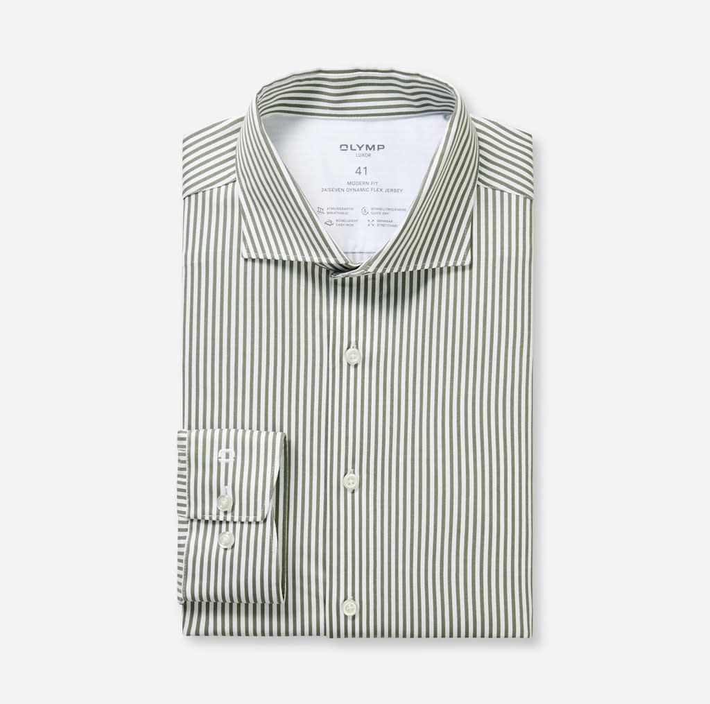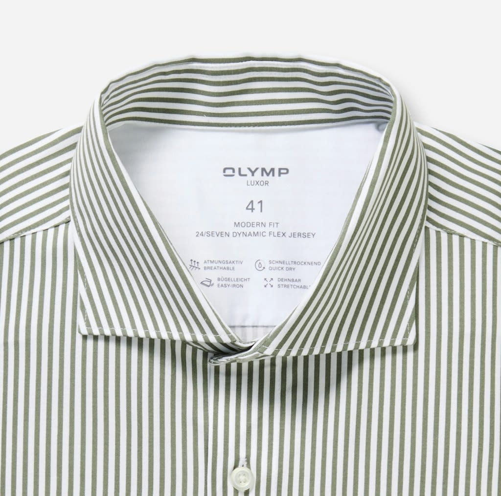Stijl. Lichtheid, coolheid, onafhankelijkheid. Dan is de nieuwe OLYMP Luxor modern fit 24/Seven precies de juiste keuze. Geen enkel ander business overhemd sluit zo goed aan bij de meest actuele modetrends. Soepel, casual en elegant verbindt het de formaliteit van de businessclass in contrastrijke dunne strepen met de frisse, functionele uitvoering van de huidige herenmode.