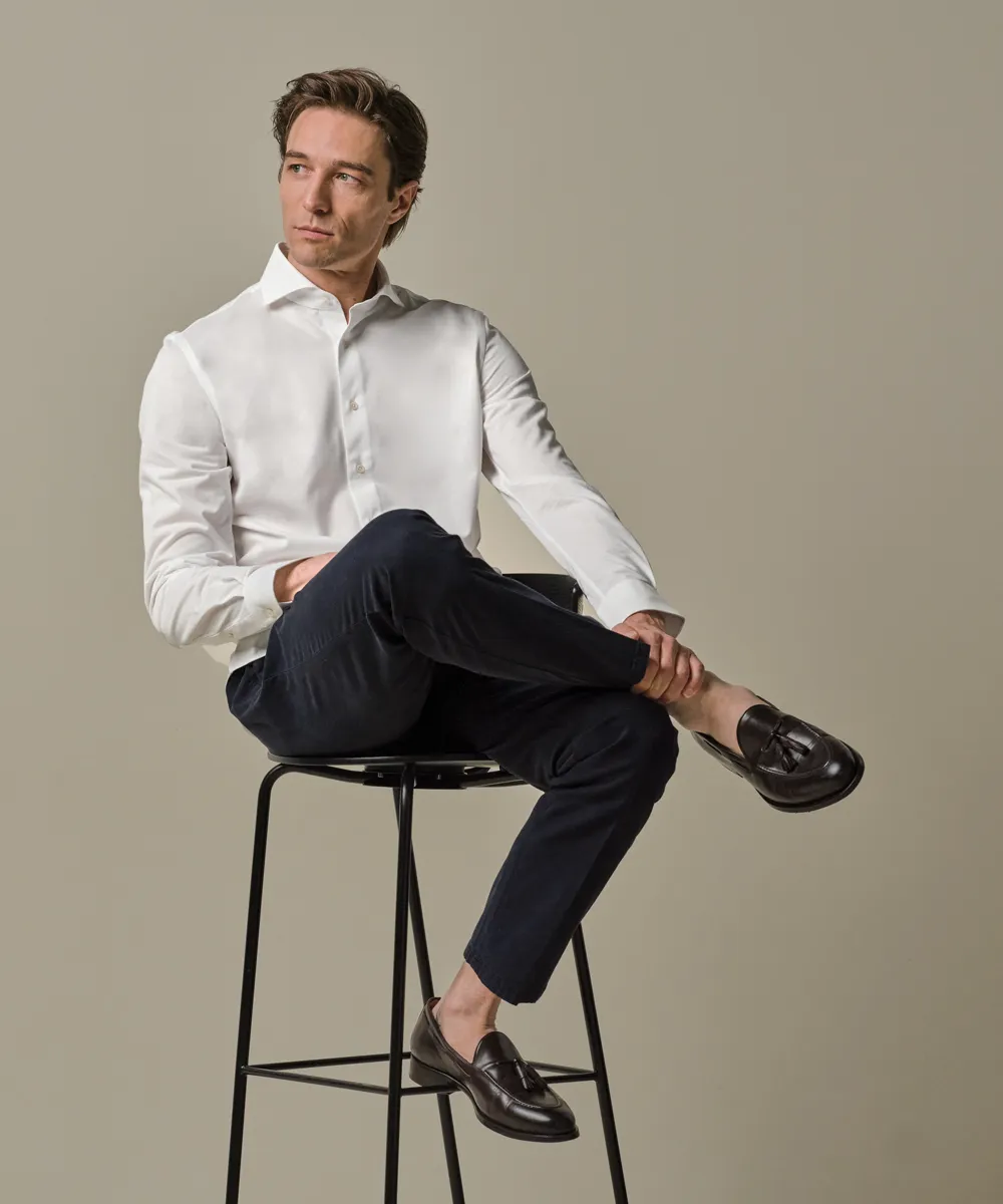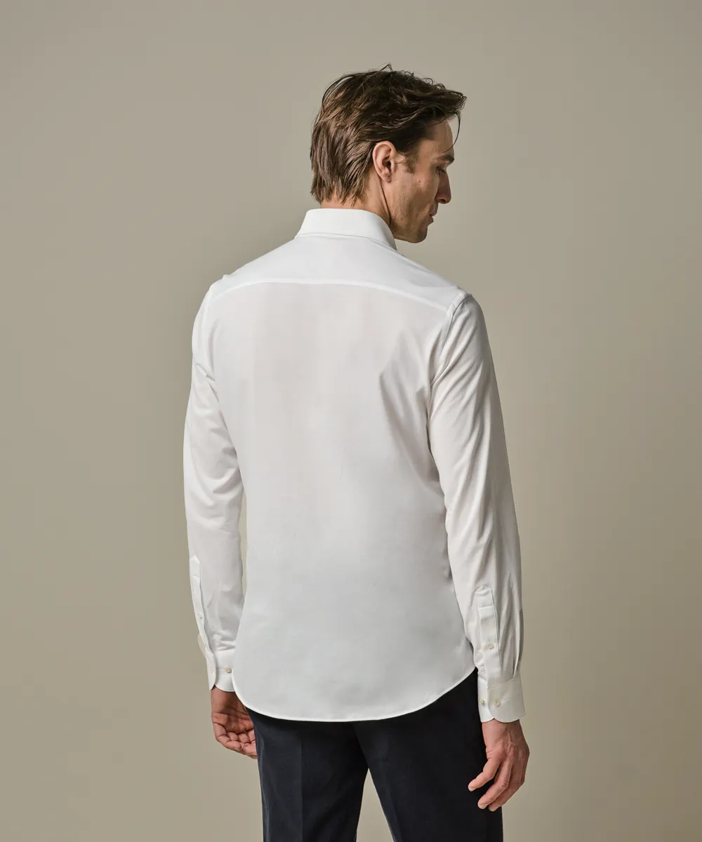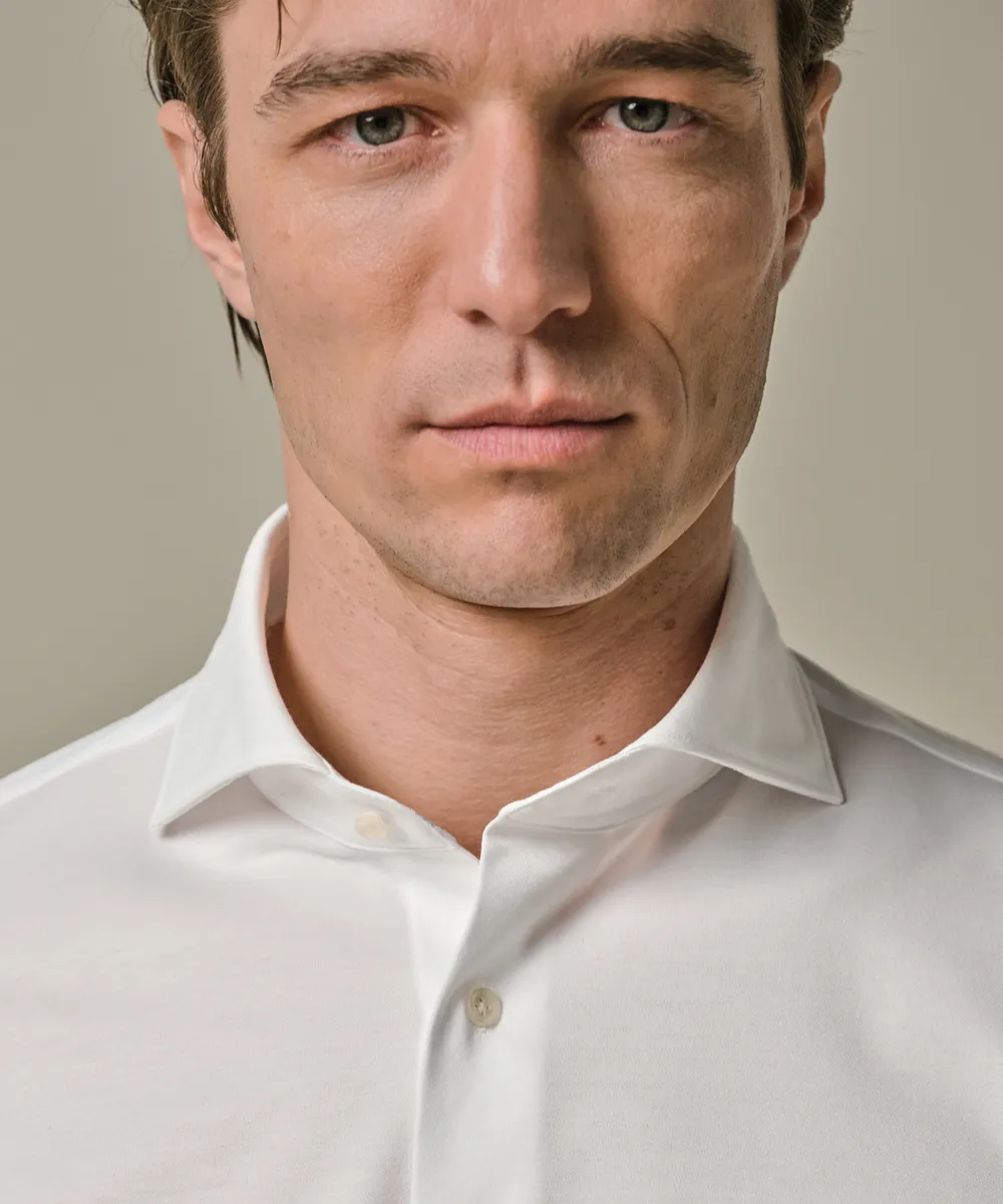 Dit witte Japanese knitted overhemd is gemaakt van een mix van katoen en hightech garen. Het gebreide overhemd combineert de elegantie van een overhemd met het comfort van een t-shirt. Een geweldig overhemd dat zowel formeel als casual gedragen kan worden. Aangezien het een gebreid overhemd is, is strijken niet meer nodig en kun je het iets rustiger aan doen in de ochtend.