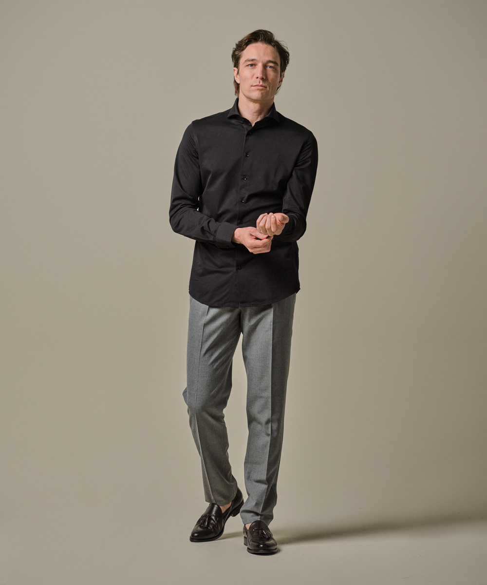 Dit zwart Japanese knitted overhemd is gemaakt van een mix van katoen en hightech garen. Het gebreide overhemd combineert de elegantie van een overhemd met het comfort van een t-shirt. Een geweldig overhemd dat zowel formeel als casual gedragen kan worden. Aangezien het een gebreid overhemd is, is strijken niet meer nodig en kun je het iets rustiger aan doen in de ochtend.