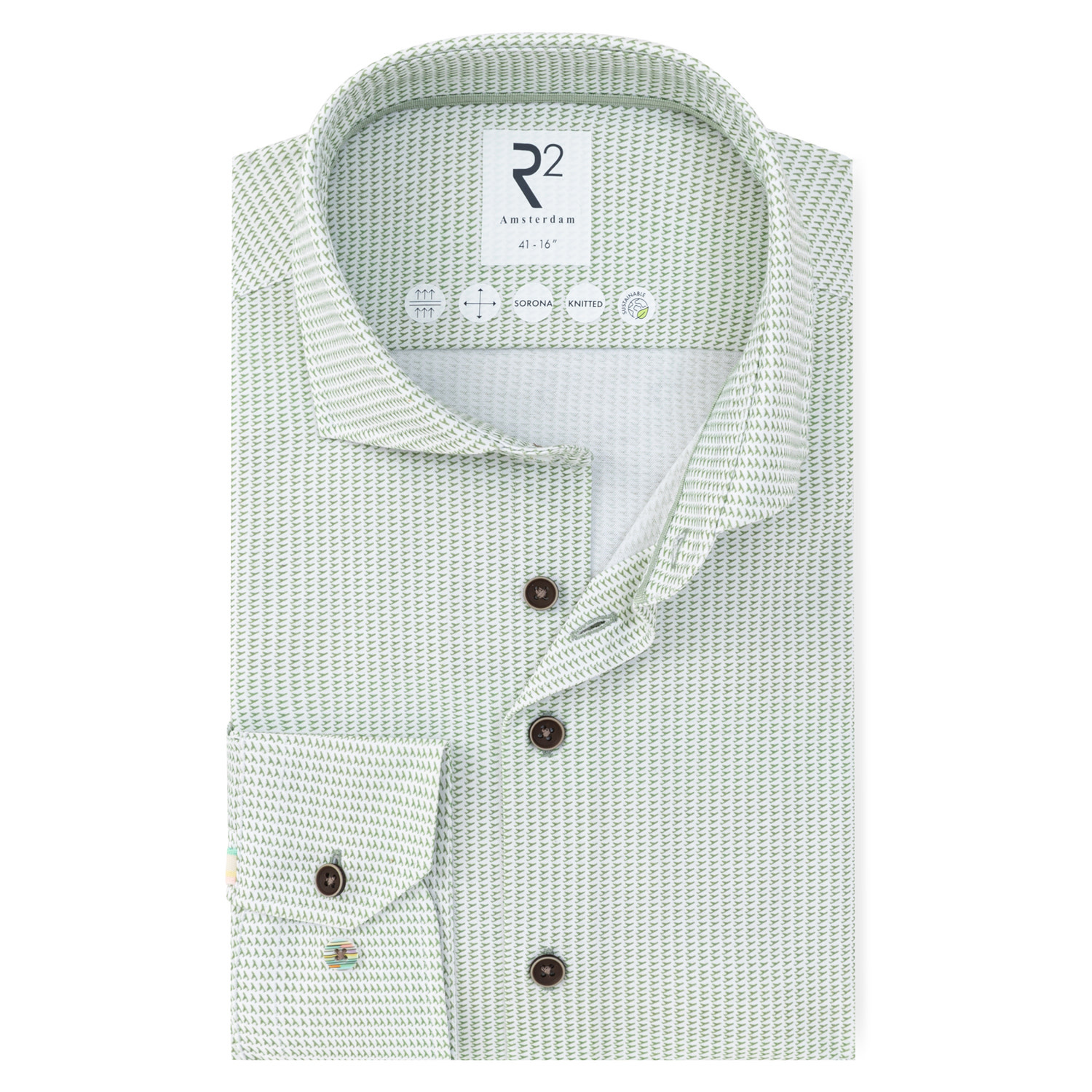 R2 Amsterdam Print Overhemd Cotton Sorona is een type stof dat bestaat uit een mix van katoen en Sorona®-vezels. Sorona is een merknaam voor een duurzame vezel ontwikkeld door DuPont, gemaakt van deels plantaardige grondstoffen (meestal maïszetmeel). Het heeft eigenschappen die het populair maken in kleding: