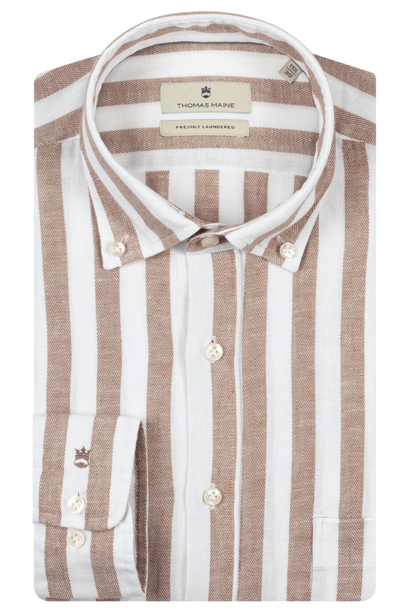 Thomas Maine Overhemd Button Down Linen Blend Herringbone Stripe 617718 col 86 Bruin